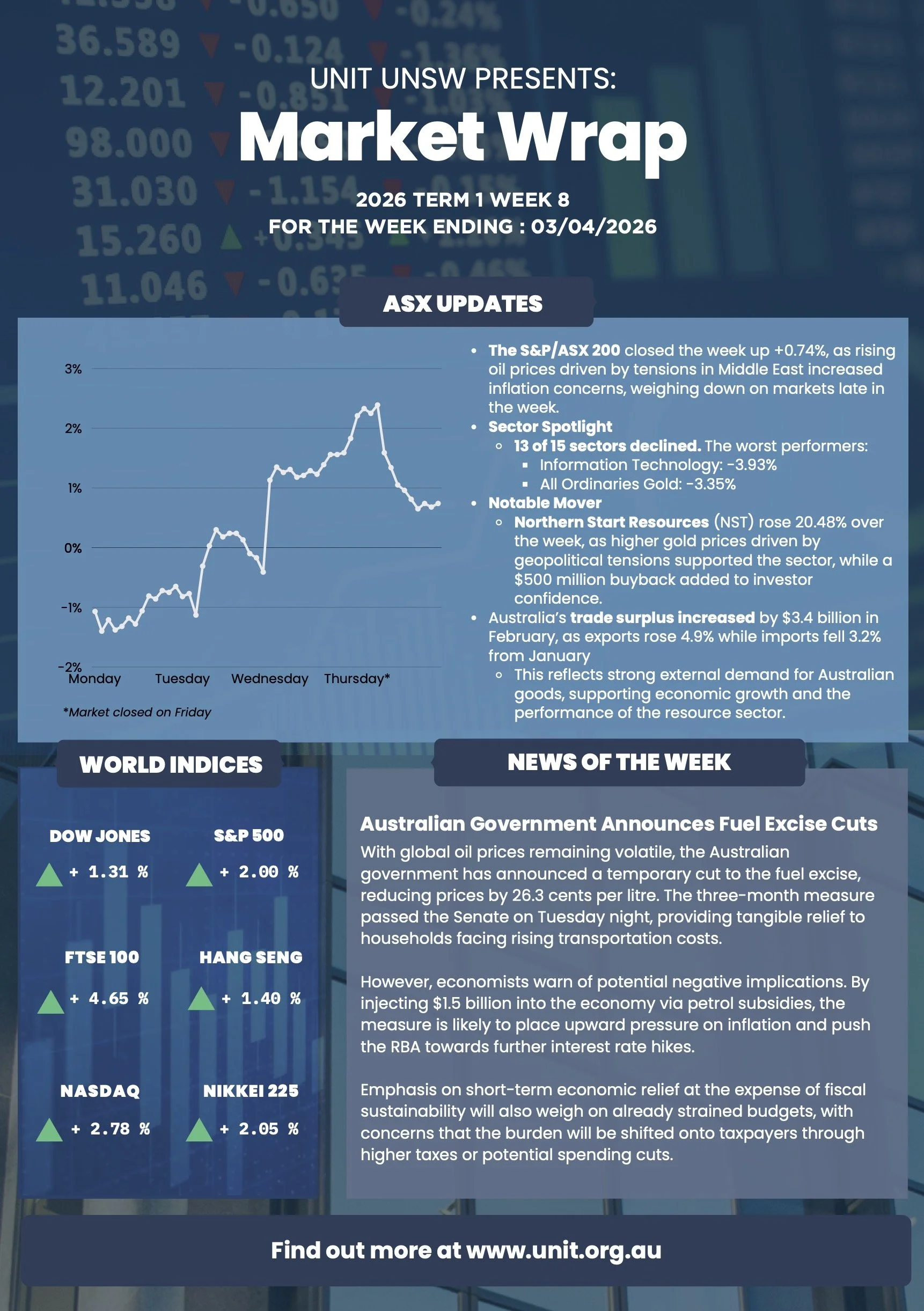 The Market Wrap is a section from UNIT’s fortnightly newsletter, The Dividend. The Dividend features the most recent finance and market news, upcoming student opportunities and placements, and UNIT’s upcoming events and programs. If you would like to read the full newsletter, please sign up via the membership link on the website header.